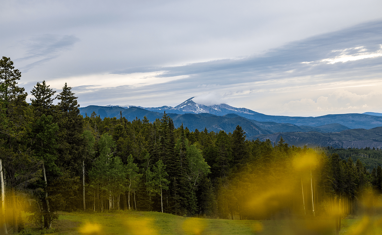 Scenic view of buttermilk mountain, clouds gather at the top of the hill with huge maroon bells peaks behind