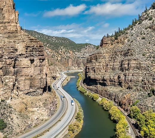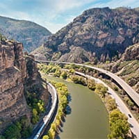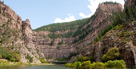 Arguably the most beautiful part of the drive, Glenwood Canyon offers a front-row seat to the mighty power of the Colorado River. In many ways, this rugged canyon is a precursor of the Colorado River's later work at the Grand Canyon, several hundred miles downstream. Stop off at the Grizzly Creek rest area to take in the scene, and marvel at the engineering of the highway’s many bridges, viaducts and tunnels. When it was complete in 1992 after decades of construction, the Glenwood Canyon stretch of I-70 marked the completion of the Interstate Highway System. The canyon is popular with rafting outfitters.