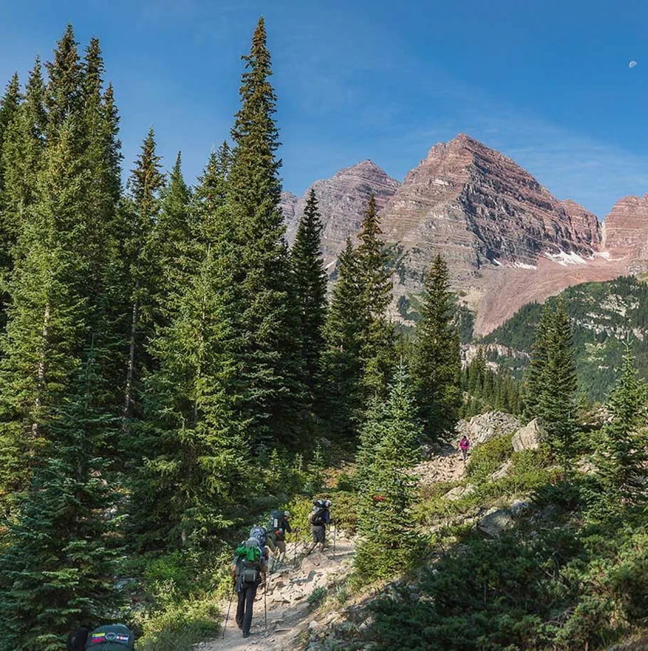 The trailhead starts at Maroon Lake and the entrance to the Maroon Bells-Snowmass Wilderness Area. The protocols for parking have changed from previous years—reservations are now required for shuttles to Maroon Lake and for overnight parking. You can reserve a parking space for vehicles up to 20 feet for $10, or for free with the America the Beautiful and the Maroon Bells Annual Passes. You can also take a shuttle—as a roundtrip or one-way—which leaves from Aspen Highlands Village multiple times a day and also requires a reservation.