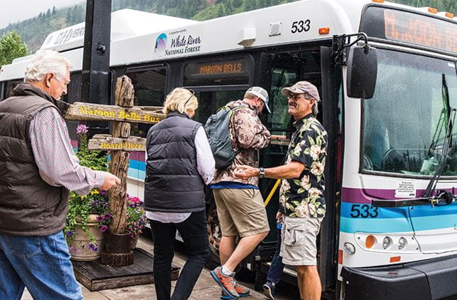 It is one of the most essential sights to see in all of Colorado: the Maroon Bells. Located south of Aspen at the end of Maroon Creek Road, these duel 14,000-foot mountains rise above a picturesque lake. To get there during the day, you need to take the shuttle bus provided.