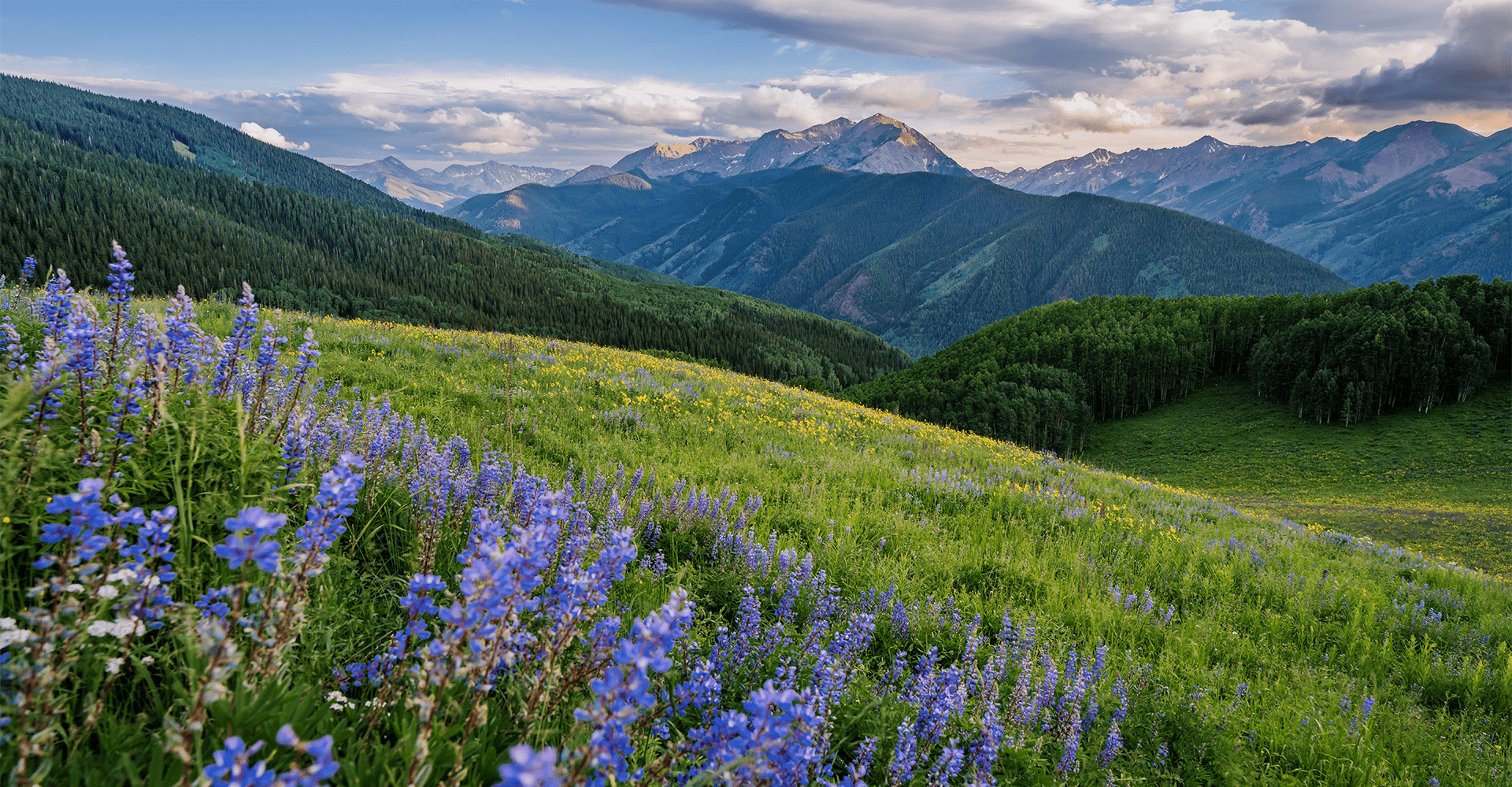 Scenic view of a green meadow in Aspen Snowmass, purple and yellow flowers cover the meter and tall green trees Gertrude from the mountains in the distance, while stark, rocky peaks glow pink in the background