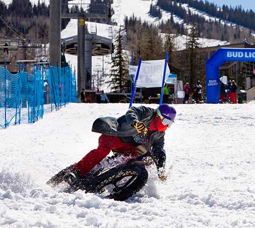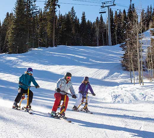 Snowbikes—not to be confused with fat bikes—do not have pedals and are actually ridden downhill on ski slopes. Originally known as skibobs, snowbikes have seats and frames similar to bicycles, but the wheels are replaced with skis. Riders also wear boots and small skis on their feet to assist in steering. Lessons are available on Snowmass.