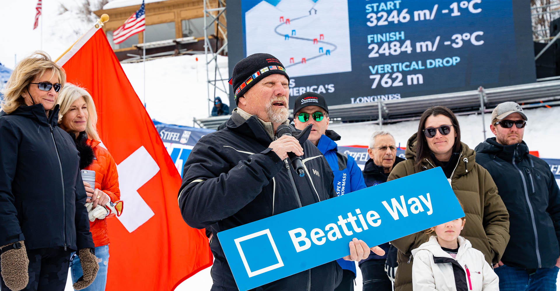 With Beattie’s son, grandson, and great-granddaughter on hand, it was unveiled that “East Fifth Avenue” trail, where America’s Downhill™ concludes, was renamed “Beattie Way,” to honor the local legend. “There is one man who stands out as a giant,” said Jim Crown, managing partner for the Crown family, owners of the Aspen Skiing Company. “That man is Bob Beattie. What could be more fitting?”