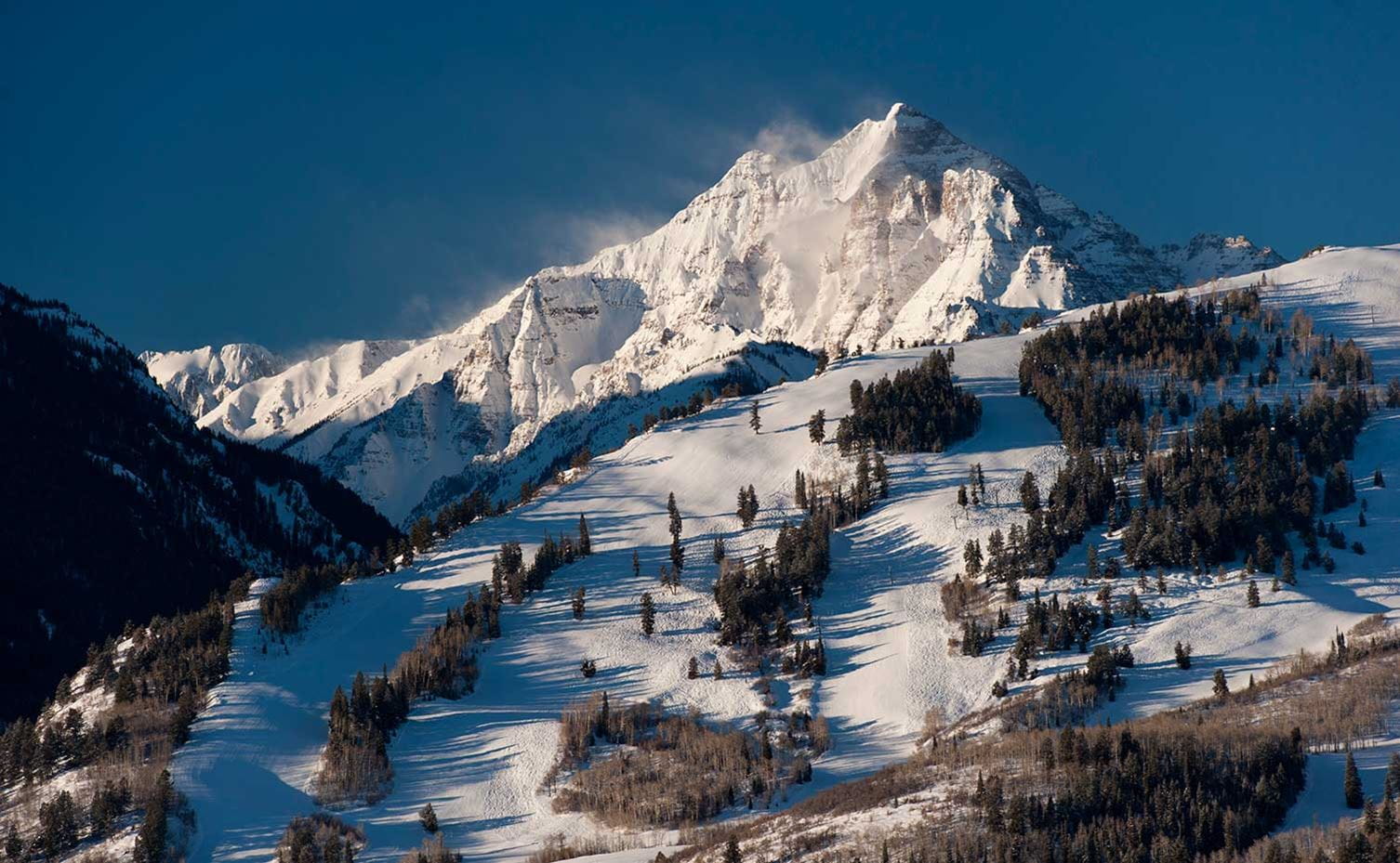Scenic view of buttermilk mountain, clouds gather at the top of the hill with huge maroon bells peaks behind