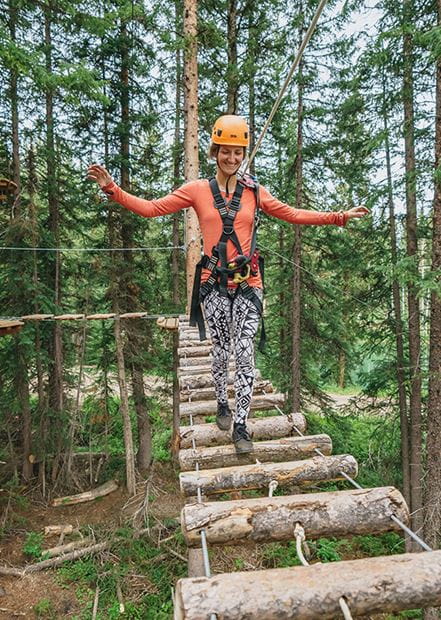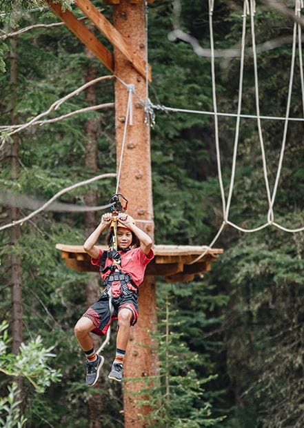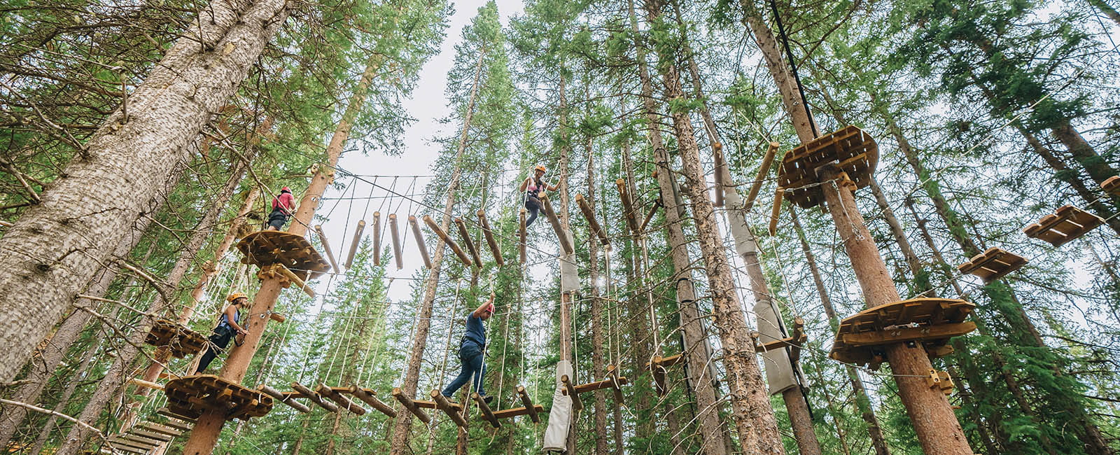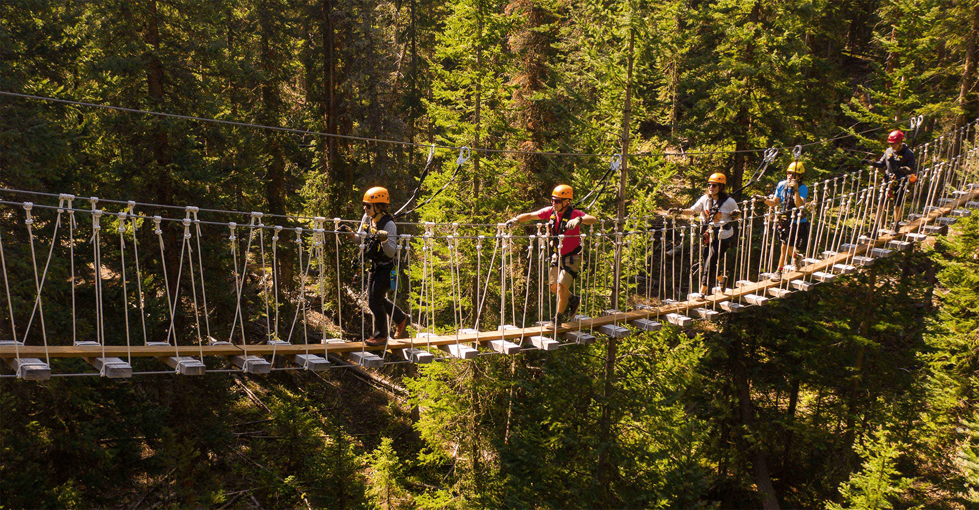 Three young people walk across a sky bridge, made of wood, within pine trees high off the ground, on a bright summer day at Lost Forrest in Snowmass Colorado