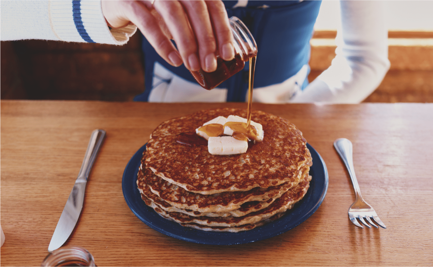 Woman pours syrup onto stack of perfectly cooked pancakes, at Bonnies in Aspen