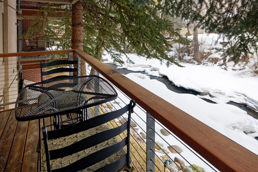 Aspen, CO 81611Chateau Eau Claire & Roaring Fork are two riverfront condominium complexes, with most rentals overlooking the majestic Roaring Fork River. These condominiums are four to five blocks to Aspen Mountain and even closer to downtown. Guests may hop onboard the free skier shuttle, which stops on Highway 82, between the two buildings. Chateau Eau Claire and Roaring Fork condos feature unique décor, full kitchens, and fireplaces. Some rentals feature balconies that overlook the Roaring Fork River. Common amenities at Chateau Eau Claire and Roaring Fork include an expansive outdoor heated pool, hot tubs, a workout facility, sauna, and a conference center available upon request. Chateau Eau Claire features an elevator that accesses all floors. Guests receive complimentary on-site parking, Aspen Airport transportation, health club passes, Wi-Fi, concierge services, housekeeping, and 24/7 maintenance support.
