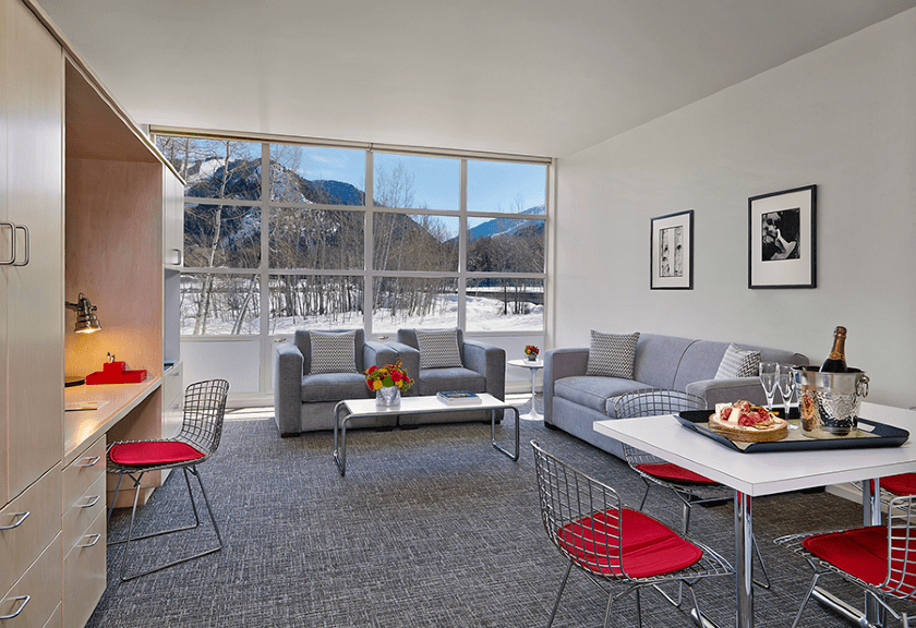 Aspen, CO 81611The Aspen Meadows Resort is a secluded destination nestled on 40 acres along the Roaring Fork River in Aspen’s historic west end. Boasting stunning mountain views, this serene natural environment fully integrates art and landscape architecture into the grounds, with an intention to inspire visitors and remind them of their relationship to nature, mind and body. Guest suites are spacious at an average 675 sq feet, and designed in the Bauhaus style, which prioritizes comfort and simplicity. Suites feature floor-to-ceiling windows, commodious sitting areas, wet bars and outdoor terraces, as well as Bauhaus inspired-furniture like Bertoia chairs and Laccio tables. Resort amenities include 24-hour shuttle service to town and Aspen airport, three meals daily or “knock & drop” room delivery from Plato’s restaurant, Fitness Center, outdoor heated saline lap pool and hottub, half-court basketball, bike and snowshoe rentals, dry cleaning/laundry service and 24-hour front desk service. During ski season, on-mountain ski and snowboard storage and overnight inter-mountain ski and snowboard transfers. In summer months, guests enjoy our outdoor tennis center, concerts at the on-property Aspen Music Festival tent, Gold Medal fly fishing, and lectures presented by the Aspen Institute or the Aspen Center for Physics. Experience the serenity of the mountains and elevate your mind, body and spirit in this unique setting, just minutes from Aspen’s eclectic downtown.