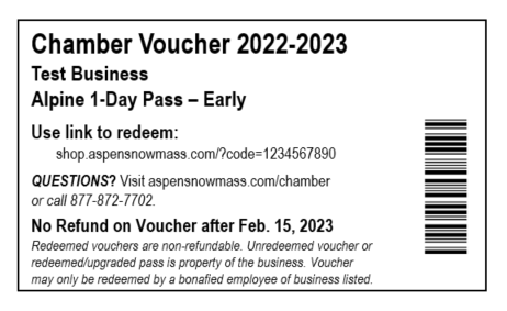 VOUCHER REFUNDS: Unredeemed 2025-2026 Chamber pass vouchers qualify for full refunds back to the business if returned by January 31, 2026. Business must provide Aspen Skiing Company with unredeemed voucher ID numbers to receive a refund back to the original form of payment. Chamber pass vouchers that have been redeemed for a pass are no longer eligible for a refund, even if the pass has never been used. No refunds provided after January 31, 2026.
