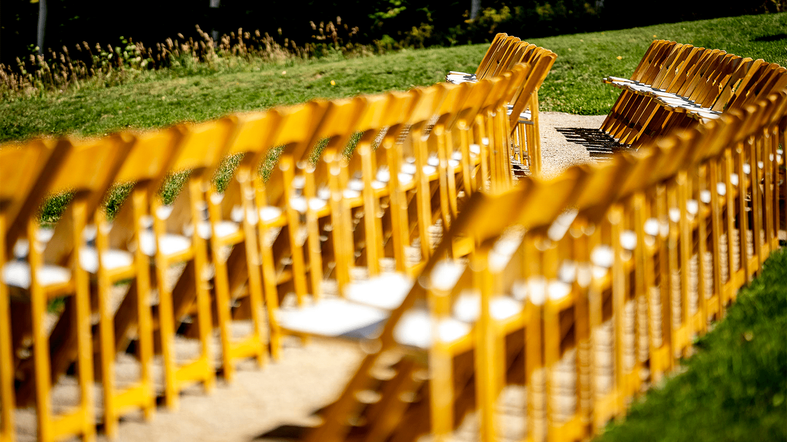 Empty wedding chairs lined up in front alter, before an outdoor wedding at Snowmass. Blue sky and light falls colors surround the space