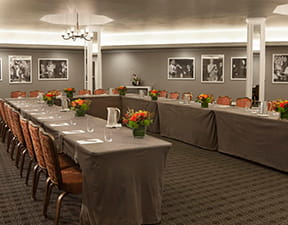 Featuring neutral tones of grey, black and white, a concealed drop down screen, the Grand Salon on the lower level can accommodate 120 seated guests or 175 for a reception.